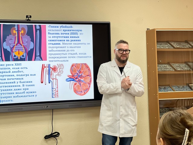 На этот раз студентов посетил врач-нефролог Шерстнев Андрей Владимирович с лекцией о хронической болезни почек, а также схемах лечения пациентов с тяжёлой почечной недостаточностью.